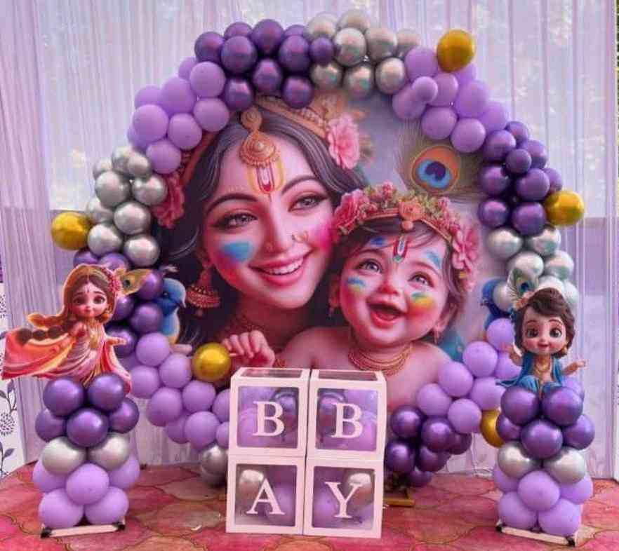 Baby Shower Purple Silver Balloon Arch With Krishna Theme Backdrop premium event decor in Noida, Ghaziabad & Greater Noida