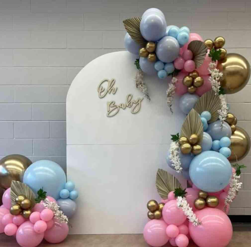 Modern Pastel Pink And Blue Baby Shower Decor With Balloon Garland And Gold Accents usually includes the core styling shown in the photos, with package scope based on the final theme selection. ARV Decor confirms all included items, setup size and upgrades before booking.