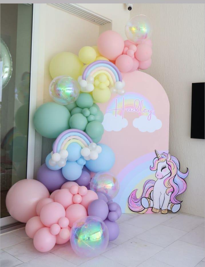 Pastel Unicorn Birthday Backdrop With Rainbow Balloon Arch For Girls usually includes the core styling shown in the photos, with package scope based on the final theme selection. ARV Decor confirms all included items, setup size and upgrades before booking.